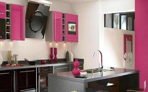 В минималистичном интерьере кухни цвет фуксии будет гармонично сочетаться с серым цветом металлических деталей. В такой комбинации яркий оттенок не будет назойливым. Весьма динамично, но элегантно смотрится сочетание «серый-черный-фуксия»: чем больше черного в этой комбинации, тем ярче выглядит помещение, а преобладание серых деталей смягчает и облагораживает интерьер.