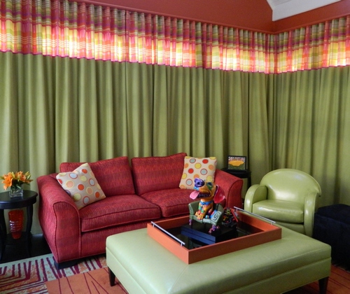 Учитывая, что оба цвета – яркие, их сочетание лучше использовать в элементах декора. Крупные плоскости в помещении рекомендуется оформить в нейтральных тонах: обои цвета фуксии, будучи очень активным пятном, вскоре могут начать раздражать. Если душа лежит к экстравагантным решениям, самая объемная яркая деталь, которую имеет смысл себе позволить – это шторы цвета фуксии.