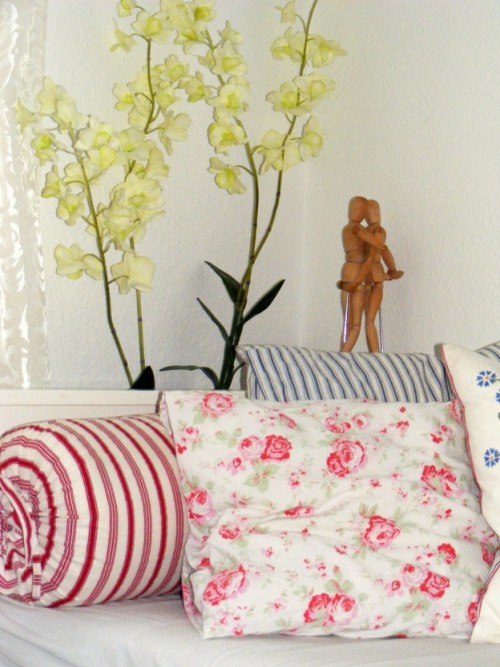 По бокам кровати можно поставить прикроватные тумбочки, на них настольные лампы со слабым освещением, или с возможностью его приглушить, или же светильник бра на стене над каждой тумбочкой. На прикроватных тумбочках поставьте ваше совместное фото или статуэтки в романтическом стиле, обязательно парные.
