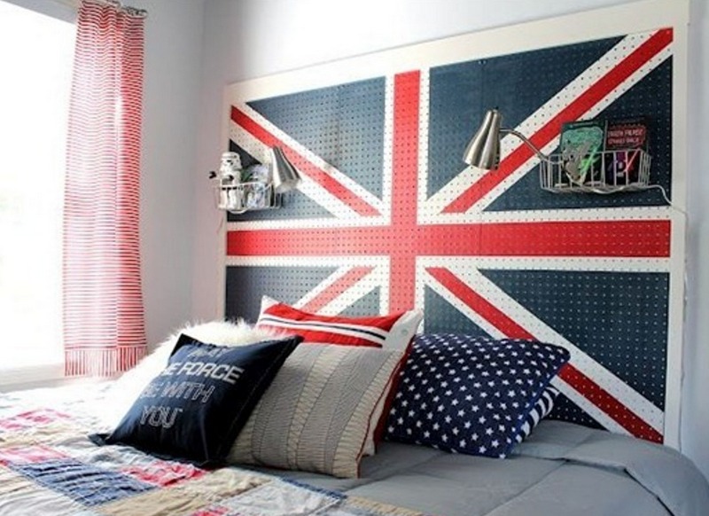 А в спальне, особенно в подростковых детских комнатах, стильно будет смотреться кровать, устланная покрывалом или пледом в виде флага. Вообще для спальни есть множество аксессуаров с флагом, особенно с британским «Union Jack», к примеру, постельное белье, жалюзи, мебель (шкаф, комод), маленькие прикроватные коврики или большой ковер на полу, лампы, картины, всевозможные сувениры. Кстати, флаг может «подружиться» и с таким украшением интерьера, как географические карты.