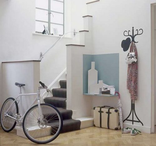 Это, наверное, одно из самых удачных мест хранения велосипеда в квартире. Вернувшись домой с велопрогулки, нет надобности нести его через всю квартиру на балкон, а можно прямо здесь пристроить его с помощью настенных крючков или на других приспособлениях, о которых мы поговорим ниже. К тому же, это очень удачный вариант с точки зрения гигиены, ведь согласитесь, в этом случае грязь и пыль не разносятся по всей квартире, а аккумулируются в прихожей, которую, как правило, легко содержать в чистоте.