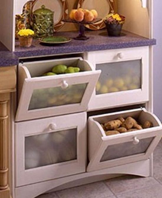 Несколько идей для хранения на кухне овощей помогут их держать не только на виду, но и в порядке. Самый оптимальный вариант – сделать ящик с выдвижными полочками, где каждая секция будет отведена для отдельного овоща, к примеру, в нижнем ящике будет храниться картофель, в среднем лук, а в верхнем чеснок. В условиях малогабаритной квартиры такой ящик лучше встроить в шкаф.