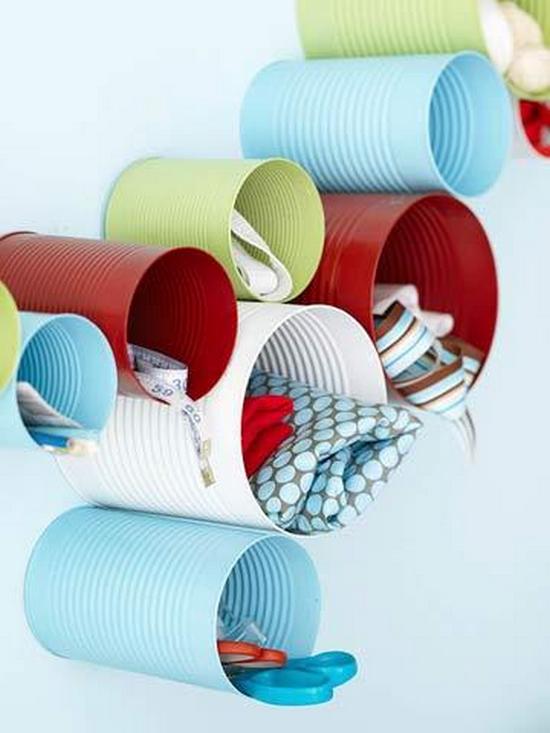 Для инструмента лучше пошить кармашки, где в каждой секции по отдельности будут размещены ножницы, ножи, линейки и карандаши. Мелкие предметы, такие как пуговицы, кнопки и различные застежки удобно хранить в прозрачных банках, причем не просто на столе, а более оригинальным способом – в подвешенном состоянии. Для этого нужно приклеить или прикрутить металлическую крышку снизу полки, а банку просто навинчивать на нее. Таким образом, все рукодельные будут не только на виду, но и содержаться в порядке.