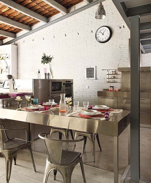 На кухне в стиле лофт царит покой и порядок, здесь все на своих местах. Светлые стены и кухонный гарнитур перемешивается с современной техникой и новомодной сантехникой. На такой кухне органично смотрится суперсовременные джойстиковые смесители и стальные мойки. А кухонный фартук можно оборудовать не только плиткой «под кирпич», но и блестящими стальными или стеклянными панелями.