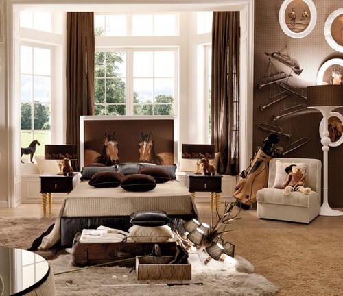 Коричневой цвет мебели для детской отлично будет сочетаться с голубыми, розовыми или персиковыми обоями. А яркие акценты на шторах, покрывале, детском постельном белье, а также картины и рисунки на стенах светло-коричневой гаммы замечательным образом украсят детскую комнату, наполнив радостью и веселым настроением. Выгодным решением в детской комнате будет сочетание коричнево-оранжевой гаммы оттенков.