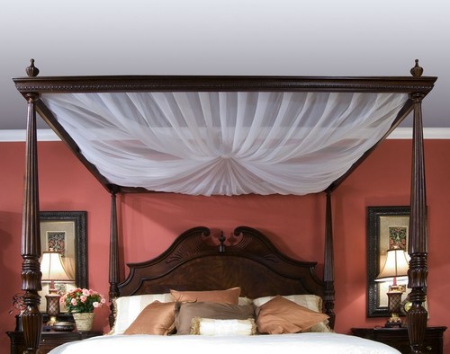 В современном интерьере использовать деревянную кровать с балдахином также возможно. Ровные правильные линии конструкции без резьбы и украшений, часто выполненные в темном цвете, отлично сочетаются с белыми летящими шторками завеса.