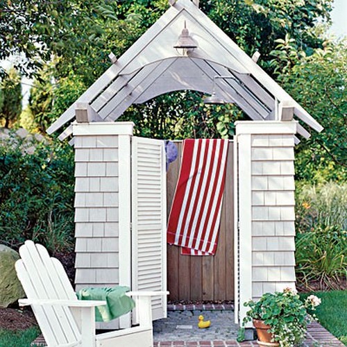 В нашем “совковом” понимании душ для дачи – это деревянная коробка с баком наверху, здесь же можно увидеть насколько эстетично может выглядеть это строение, да и простая стойка-душ почему-то ни у кого в голове не возникает, как наиболее простое и оригинальное решение для жаркой погоды.