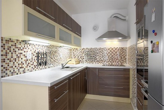 Традиционно для отделки стен используют керамическую мозаику или мозаичную плитку. Керамическая мозаика для кухни может быть глазурованной, матовой или со “спецэффектами” – разноцветными вкраплениями или разводами. Такой вариант мозаики смотрится довольно просто, но если сделать комбинированную мозаику, используя несколько материалов, интерьер кухни станет более оригинальным и интересным.