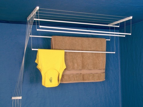 Потолочные являются классическим вариантом, только сегодня они несколько усовершенствованные и модернизированные. Их особенность заключается в том, что располагаются такие сушилки высоко под потолком, при этом совершенно не мешая домашним делам. При необходимости конструкцию можно опустить ниже, развесить белье, а затем снова поднять к потолку и оставить белье сохнуть. Изготавливаются такие конструкции из алюминия или стали. В процессе производства потолочная сушилка для белья покрывается специальными составами, защищающими от коррозии и ржавчины.