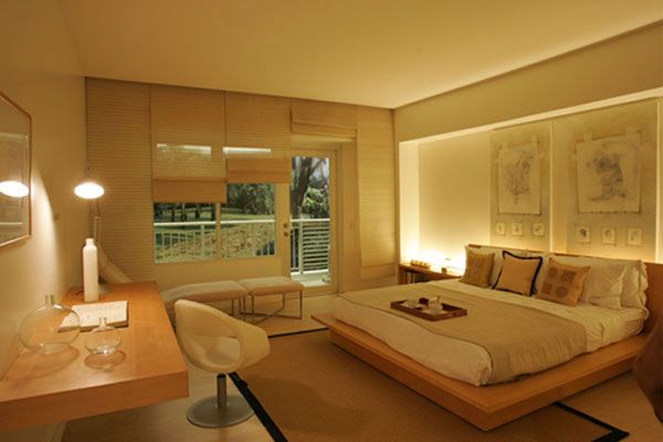 Откажитесь от потолочных ламп. Замените их настенными лампами, цветовыми панно, а то и вовсе подсветкой, которую можно спрятать за декоративные панели или за мебель. Подбирать же свет лучше всего, изначально помня о том, что вам понадобится разное освещение, а потому в вашей спальне должно быть как минимум три вида осветительных приборов: